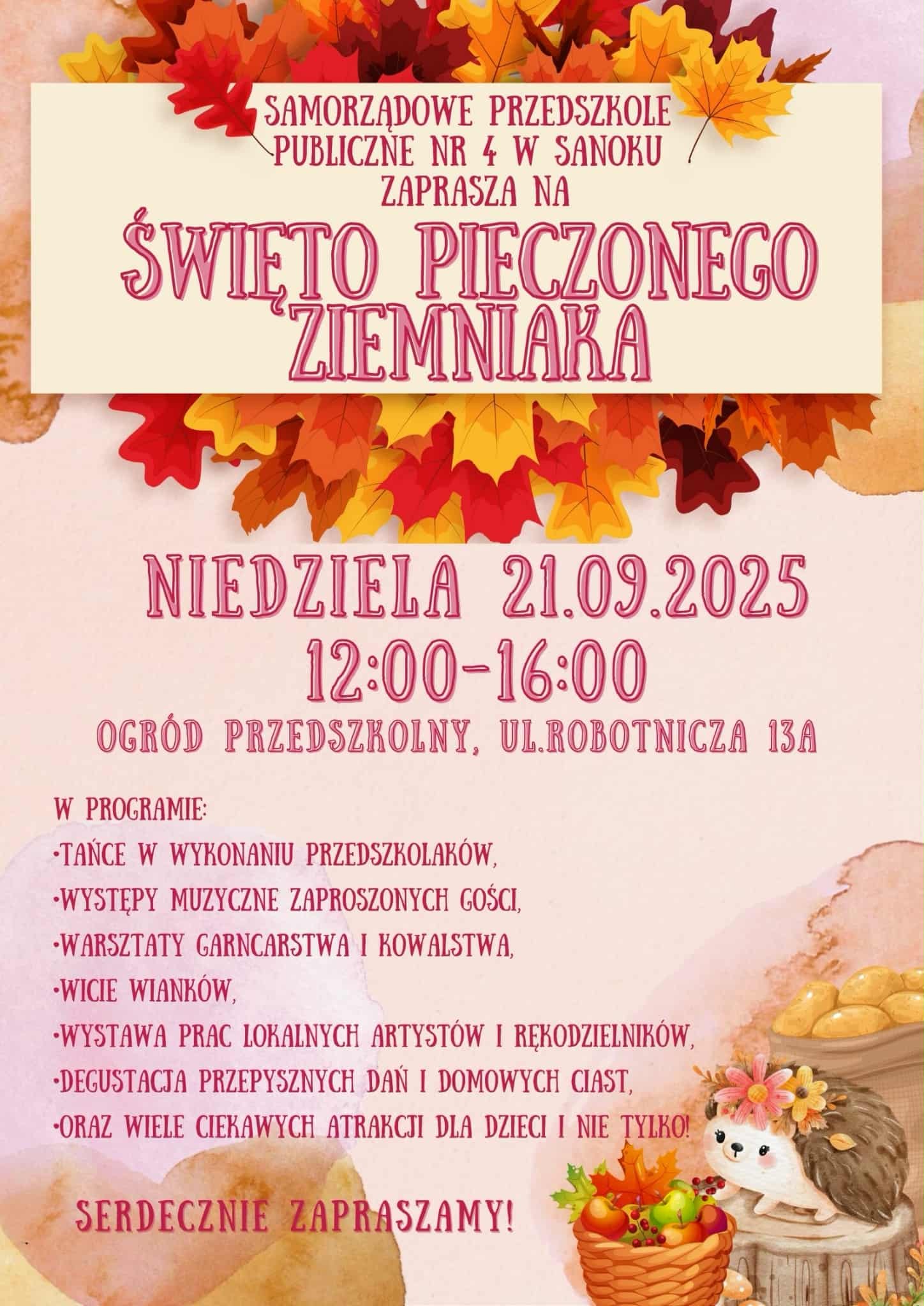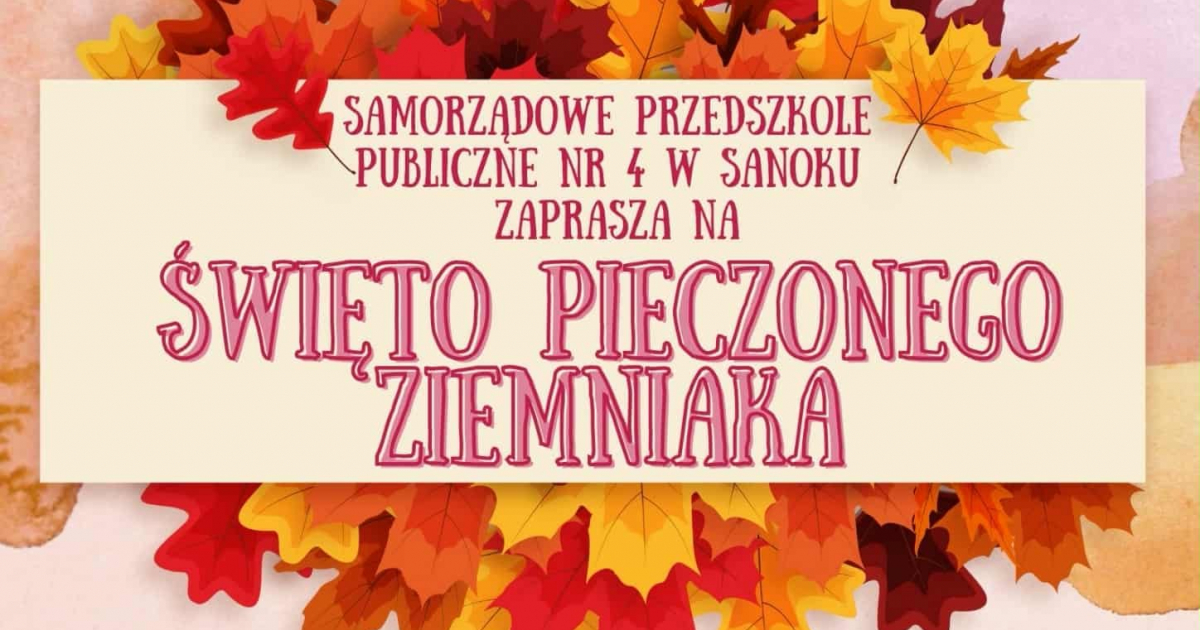 Samorządowe Przedszkole Publiczne nr 4 w Sanoku serdecznie zaprasza mieszkańców miasta i okolic na Święto Pieczonego Ziemniaka, które odbędzie się w niedzielę 21 września w godzinach od 12:00 do 16:00 w ogrodzie przedszkolnym przy ul. Robotniczej 13A.