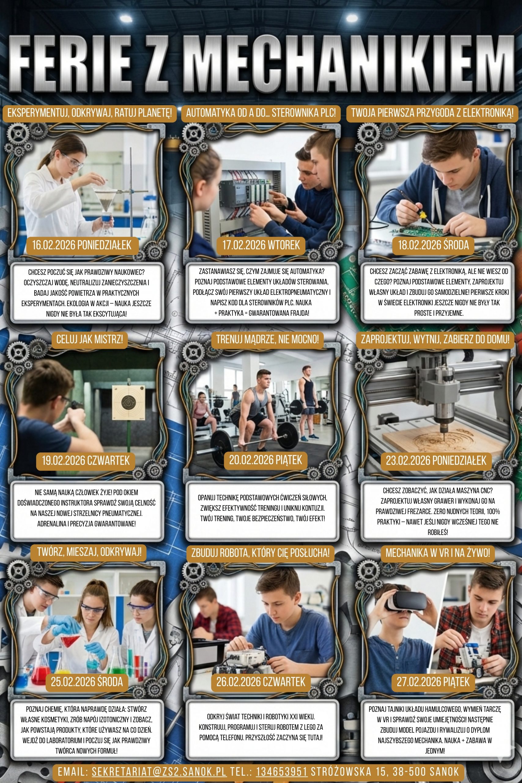 Zespół Szkół Nr 2 w Sanoku zaprasza uczniów klas 7 i 8 szkół podstawowych do udziału w warsztatach „Ferie z Mechanikiem”, które odbędą się w dniach 16–27 lutego. To propozycja dla młodych osób zainteresowanych naukami technicznymi, które chcą w aktywny i praktyczny sposób spędzić ferie zimowe.
