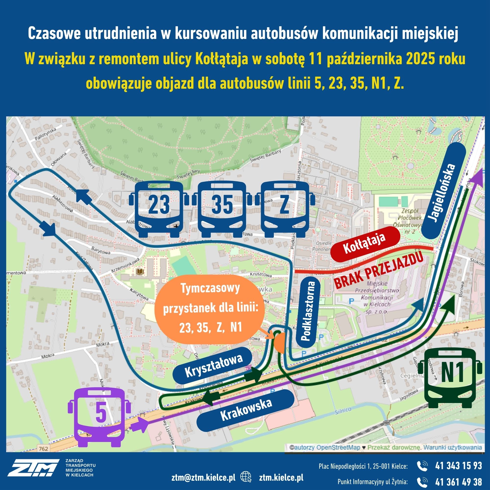 Zarząd Transportu Miejskiego w Kielcach informuje, iż w związku z koniecznością wykonania robót bitumicznych na ulicy Kołłątaja w sobotę 11 października 2025 roku zostają wprowadzone czasowe zmiany w funkcjonowaniu autobusów komunikacji miejskiej: