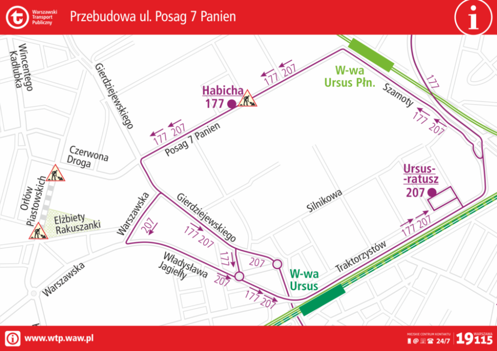 „Na czas przebudowy autobusy linii 177 jadące z Bemowa będą kończyły swoją trasę na przystanku Habicha 01, zamiast na pętli Ursus-Niedźwiadek” – poinformował Zarząd Transportu Miejskiego. Jadąc w przeciwną stronę, ruszą z przystanku Habicha 01 i ulicami Posag 7 Panien, Gierdziejewskiego, Balicka, Władysława Jagiełły, Traktorzystów i dojadą do swojej podstawowej trasy.
