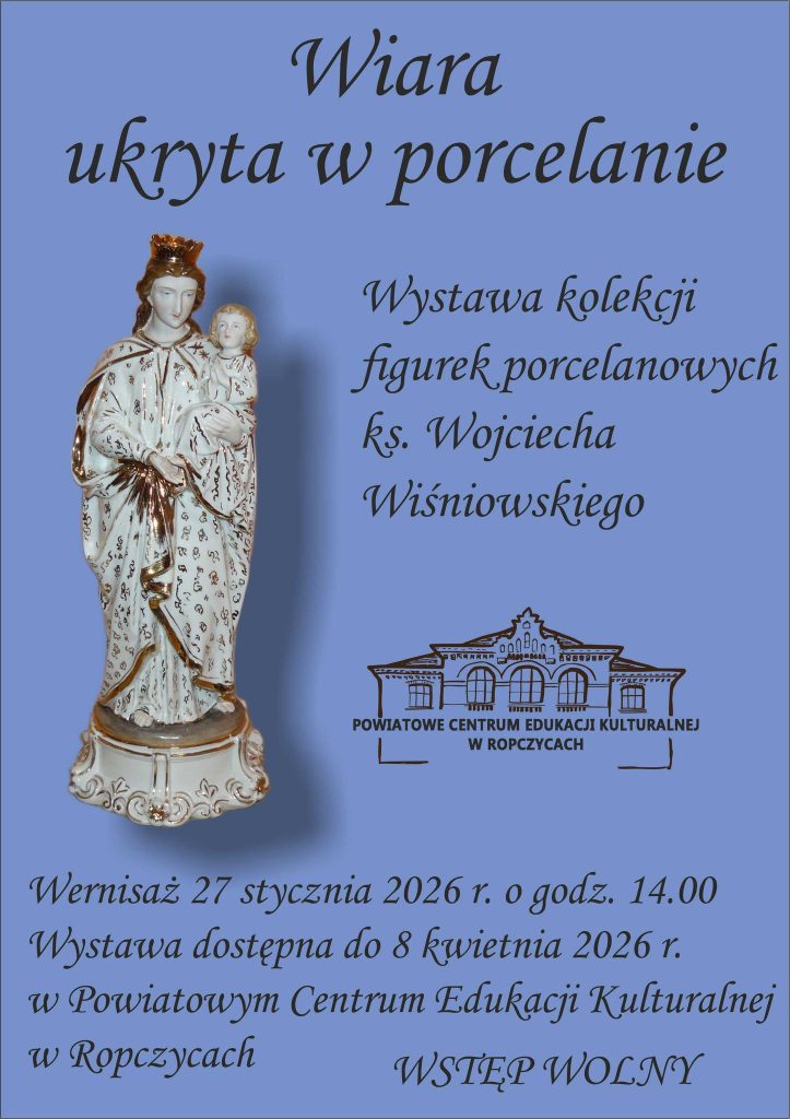 Podkarpackie Centrum Edukacji Kulturalnej w Ropczycach zaprasza na niezwykłą wystawę zatytułowaną „Wiara ukryta w porcelanie”, prezentującą bogatą kolekcję figurek porcelanowych autorstwa i ze zbiorów ks. Wojciecha Wiśniowskiego. Otwarcie wystawy odbędzie się 27 stycznia 2026 roku (wtorek) o godz. 14.00 w sali nr 11 na I piętrze PCEK.