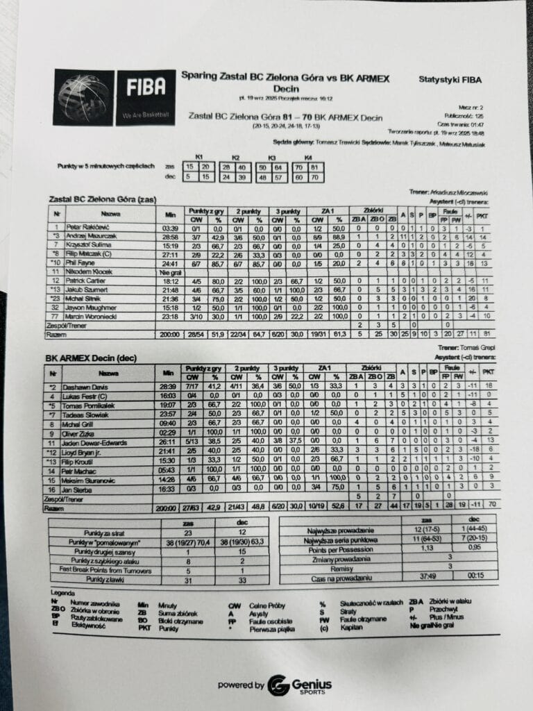 Zielonogórzanie w piątek, w hali przy ul. Amelii zmierzyli się z czeską ekipą BK Dečin. Zastal wygrał 81:70, a mecz mogli oglądać posiadacze karnetów na nadchodzący sezon. Początek zdecydowanie należał do zielonogórzan, ale z czasem gra się wyrównała. Zastalowcy jeszcze popełniali sporo błędów, widać wciąż jeszcze “ciężkie” nogi. Goście zebrali aż 17 piłek spod tablicy zielonogórzan, ale popełnili też aż 19 strat, przy 9 Zastalu. Poniżej statystyki. Zobaczcie także materiał wideo.