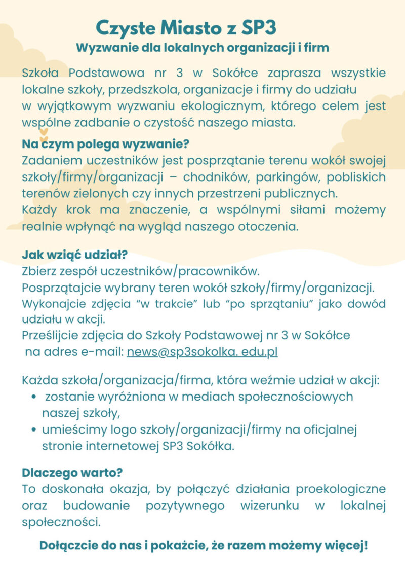 Szkoła Podstawowa nr 3 w Sokółce zaprasza wszystkie lokalne szkoły, przedszkola, organizacje i firmy do udziału w wyjątkowym wyzwaniu ekologicznym ph. „Czyste Miasto z SP3”, którego celem jest wspólne zadbanie o czystość naszego miasta.