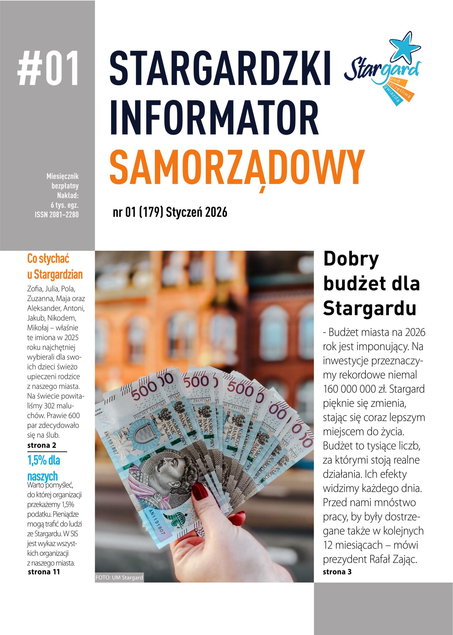 Przed nami 12 kolejnych wydań Stargardzkiego Informatora Samorządowego. Na dobry początek – garść ciekawostek z minionego roku i śmiałe plany na obecny. W najnowszym wydaniu SIS przyglądamy się budżetowi Stargardu, który w 2026 jest naprawdę imponujący. Dodatkowo nasze miasto zostało uznane za ośrodek subregionalny, a to oznacza nowe ścieżki rozwoju. Interesujące statystyki jak zawsze opracował też Urząd Stanu Cywilnego. Dowiadujemy się z nich m.in. jakie imiona najchętniej wybierali dla swoich pociech świeżo upieczeni rodzice w 2025 roku i ile par zdecydowało się na ślub. W Informatorze można również przeczytać o zupełniej nowości w Stargardzie. Ruszył Lokalny Klub Rodzinny, w którym będą m.in. konsultacje psychologiczne, spotkania z prawnikiem, pediatrą i doradcą laktacyjnym, a także zajęcia z fizjoterapeutą i położną.
