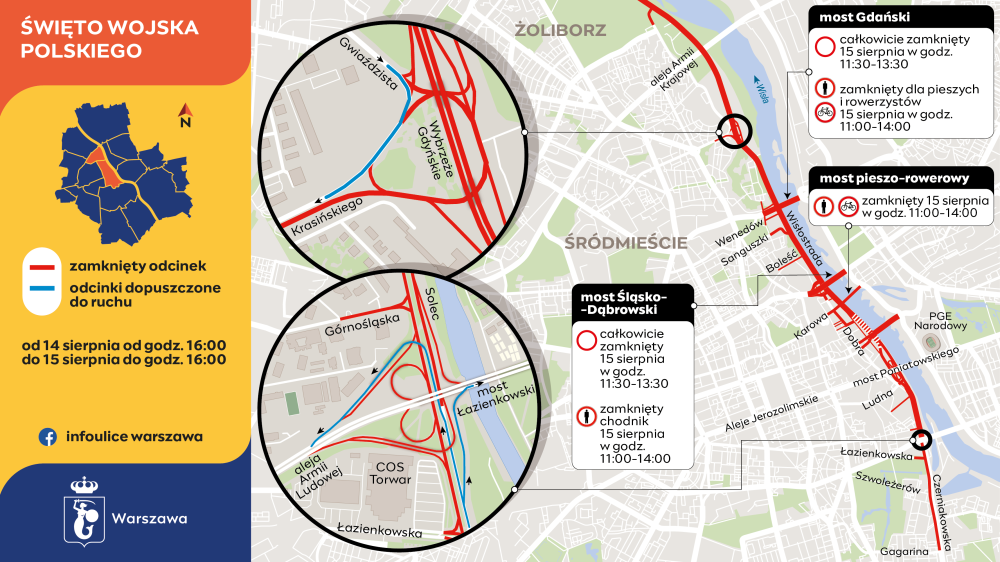 Zmiany w ruchu związane z defiladą zostały wprowadzone w czwartek, 14 sierpnia, od godziny 16:00 i będą obowiązywały do piątku, 15 sierpnia, do godziny 16:00. W tym czasie będą zamknięte ulice: