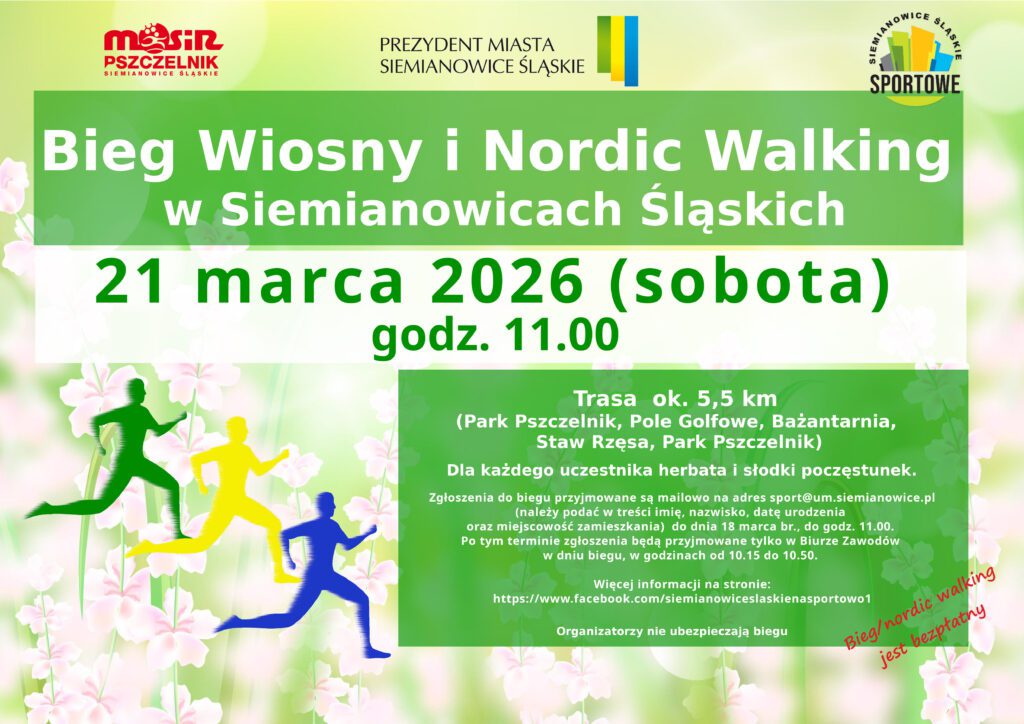 PlakatWydział Kultury i Sportu Urzędu Miasta Siemianowice Śląskie oraz Miejski Ośrodek Sportu i Rekreacji „Pszczelnik” w Siemianowicach Śląskich zapraszają 21 marca br. (sobota) na XX „Bieg Wiosny oraz Nordic Walking” o godz. 11.00. Tradycyjnie sympatycy biegania i nordic walking przemierzą 5,5 kilometrową trasę, która niezmiennie prowadzi alejkami Parku „Pszczelnik” do Pola Golfowego przez „Bażantarnię”, staw „Rzęsa” do mety w Parku „Pszczelnik”.