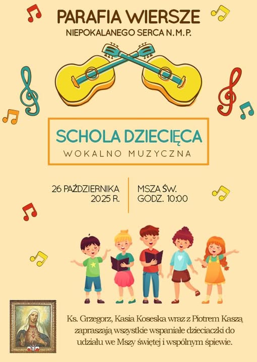Zaproszenie dla dzieci! Ks. Grzegorz, Pani Kasia Koseska oraz Pan Piotr Kasza serdecznie zapraszają wszystkie wspaniałe dzieci do udziału we Mszy Świętej z oprawą muzyczną i wspólnym śpiewem. 26 października 2026 r. (niedziela) Godz. 10:00 – Msza Święta Godz. 9:30 – krótka próba przed występem To wyjątkowa okazja, by wspólnie zaśpiewać i zaprezentować się podczas uroczystej Mszy. Serdecznie zapraszamy wszystkie dzieci i ich rodziny!