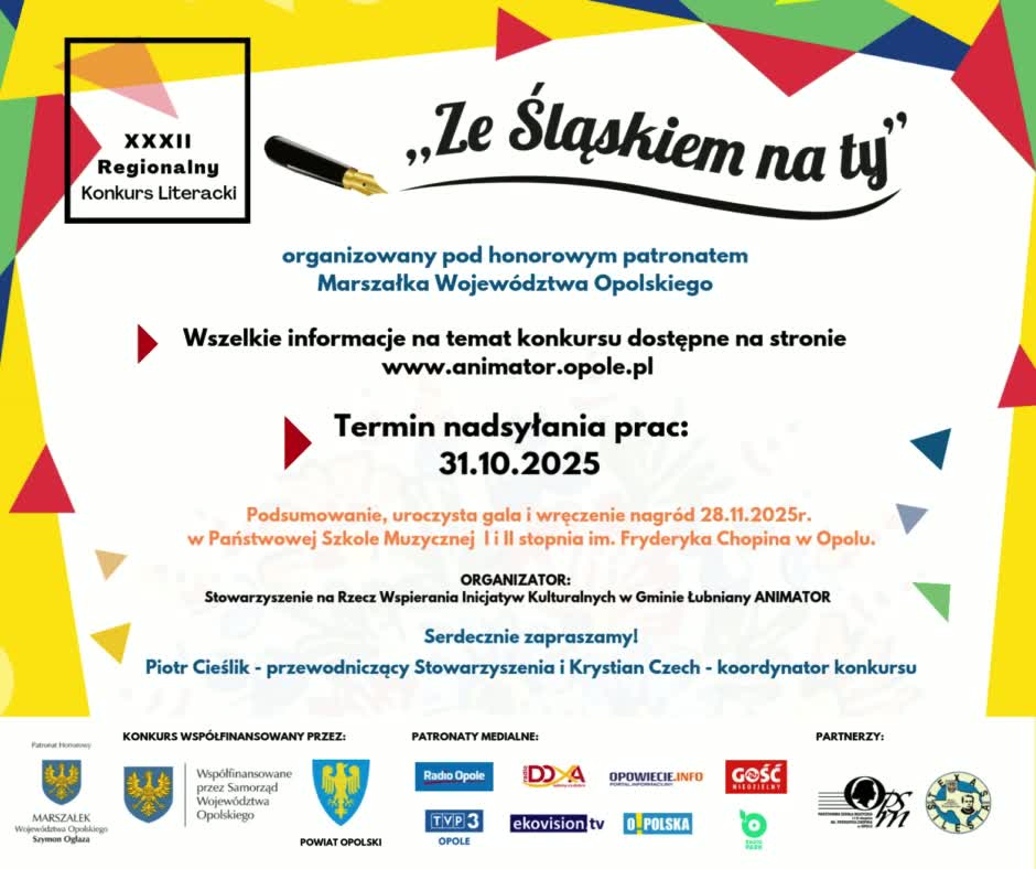 Stowarzyszenie na Rzecz Wspierania Inicjatyw Kulturalnych w Gminie Łubniany ANIMATOR zaprasza do udziału w 32. Regionalnym Konkursie Literackim „Ze Śląskiem na ty”. Regulamin konkursu i zasady uczestnictwa w konkursie dostępne są na stronie internetowej www.animator.opole.pl Prace należy przesłać na adres: