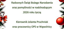 Radosnych Świąt Bożego Narodzenia oraz pomyślności w nadchodzącym 2026 roku życzą Kierownik Jolanta Pruchniak oraz pracownicy OPS w Wąwolnicy