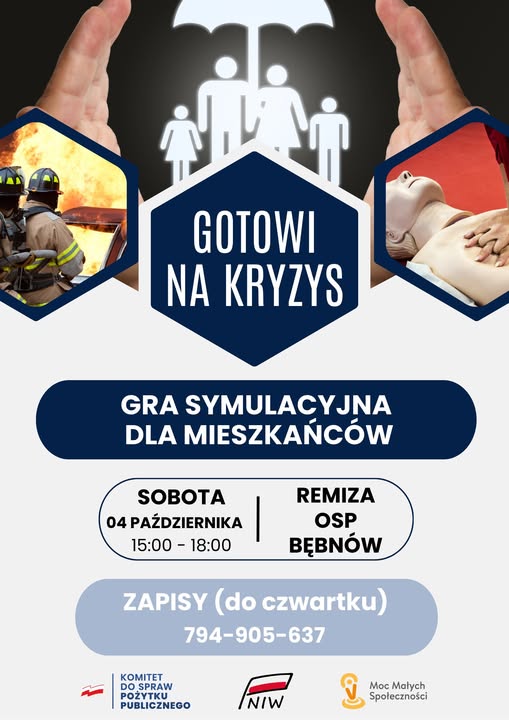 Szkolenia rozpoczną się w sobotę 4 października o godz. 15.00 w remizie OSP w Bębnowie. Tamtejsze Koło Gospodyń Wiejskich organiuje emocjonującą grę symulacyjną „Alarm w Bębnowie”.