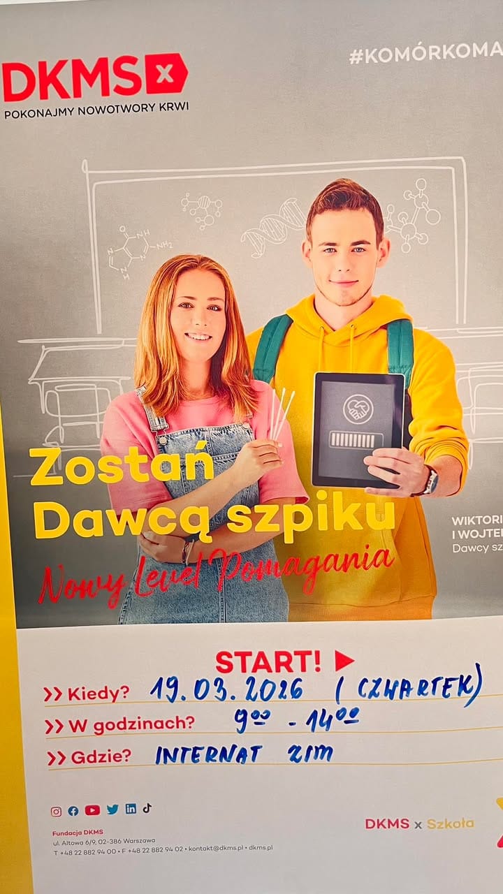 Zapraszamy do internatu ZSM gdzie odbędzie się rejestracja potencjalnych dawców szpiku