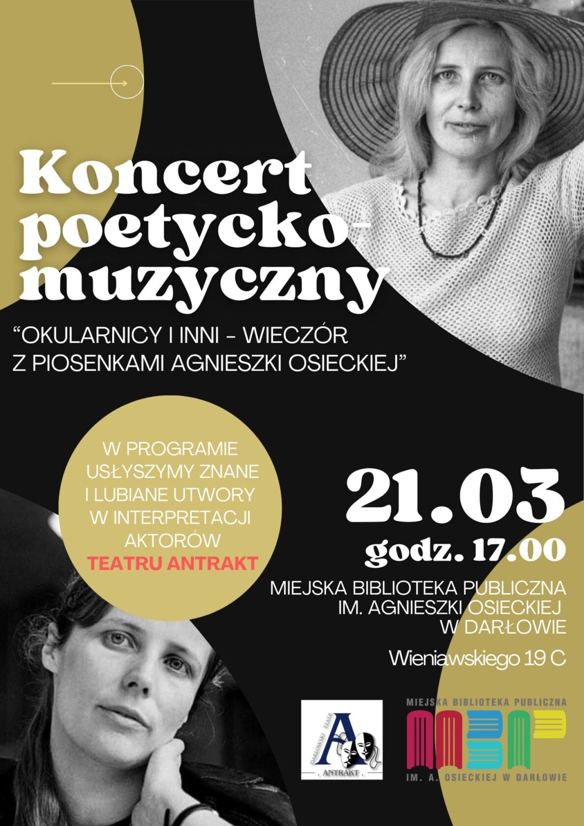 W naszej bibliotece im. Agnieszki Osieckiej w Darłowie aktorki i aktorzy Teatru Antrakt ożywią wybrane piosenki poetki w swoich autorskich interpretacjach. Muzyka przeplatać się będzie ze słowem, ciekawostkami i anegdotami.