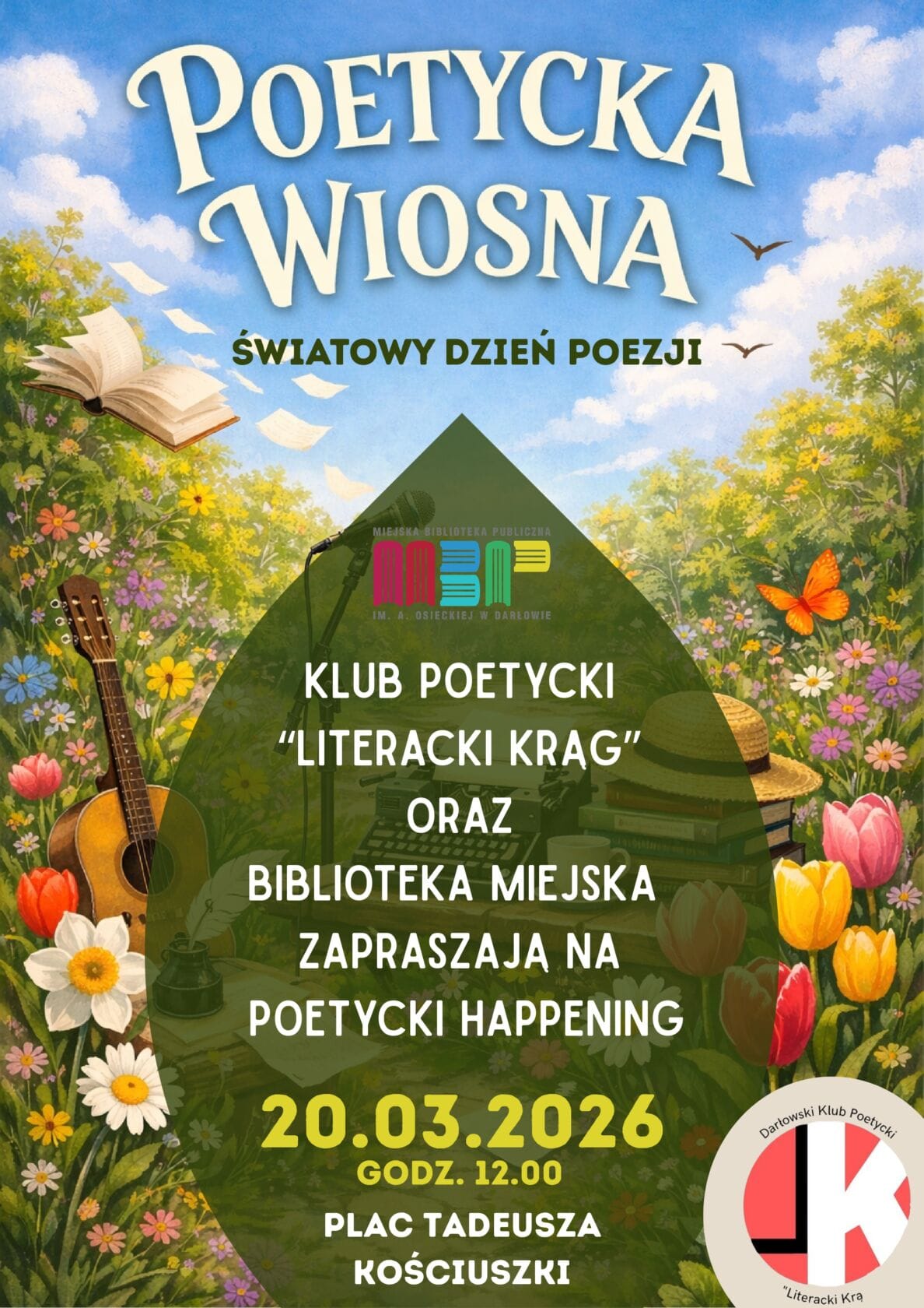 Darłowski Klub Poetycki „Literacki Krąg” oraz Miejska Biblioteka Publiczna im. Agnieszki Osieckiej w Darłowie zapraszają na poetycki happening z okazji Światowego Dnia Poezji. Zapraszamy wszystkich, którzy chcą posłuchać poezji, a także osoby piszące wiersze i gotowe przeczytać je publicznie. Swoje utwory, oraz wiersze innych autorów, zaprezentują poetki i poeci z Darłowskiego Klubu Poetyckiego „Literacki Krąg”.