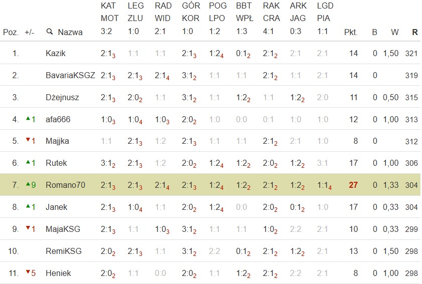 Wspomniany Romano70 miał dobry początek sezonu, gdy choćby zasiadał w fotelu lidera i długo gościł w pierwszej dziesiątce. wygląda na to, iż kryzys już za nim. Aktualna czołówka, Kazik i BavariaKSGZ trzymają dystans bo obaj zanotowali po 14 punktów.