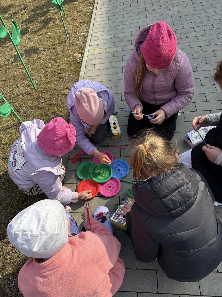Dzieci przygotowały piękne dekoracje, pełne kolorów i radości, które zachwycają swoją pomysłowością. Kwiaty, które pojawiły się przy szkole, nie wyrosły z ziemi – powstały z wyobraźni uczniów, odrobiny farby i wspólnej pracy.