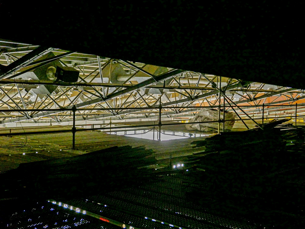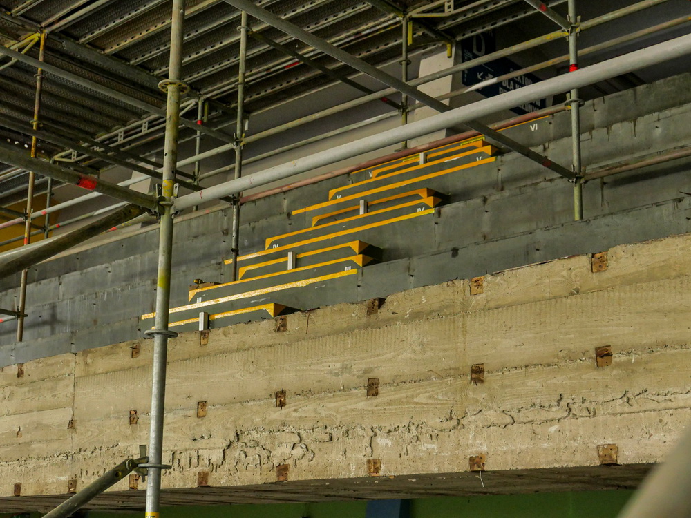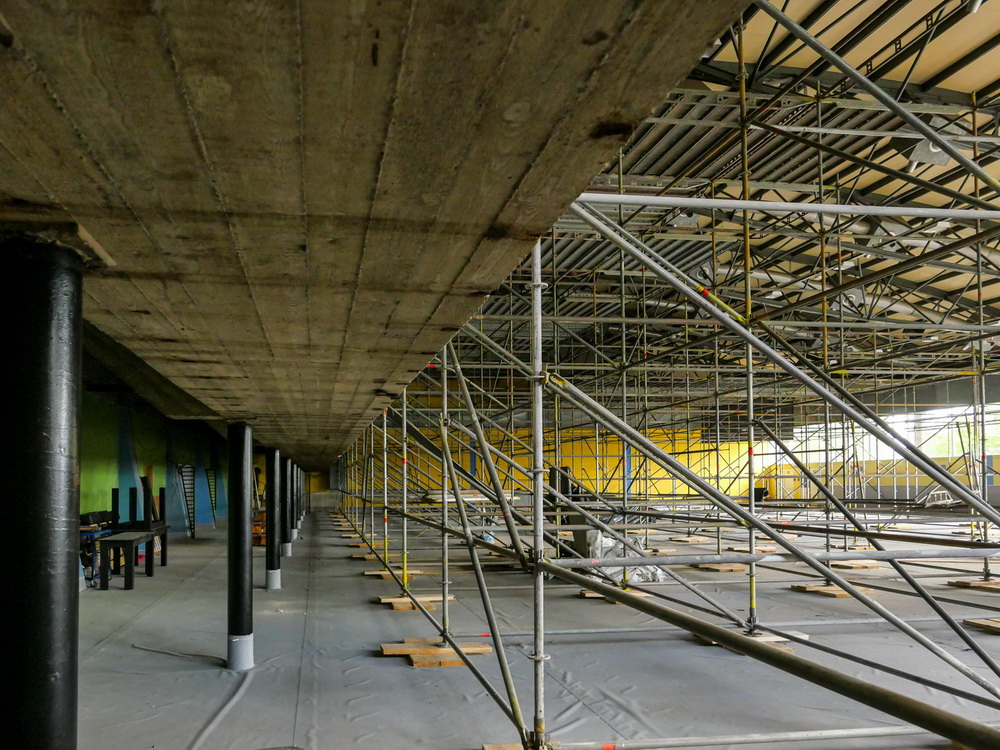 W ramach prac wewnętrznych przeprowadzono piaskowanie całej metalowej konstrukcji nośnej dachu. Tę prace poprzedził pracowity demontaż słynnej boazerii, wszechobecnej w hali. Odkryto też trybuny z betonu, które zostaną osłonięte w zupełnie nowy sposób, z zachowaniem oryginalnych elementów wystroju wnętrza.