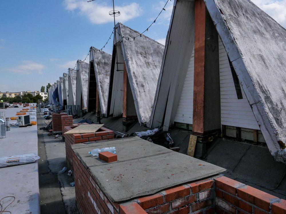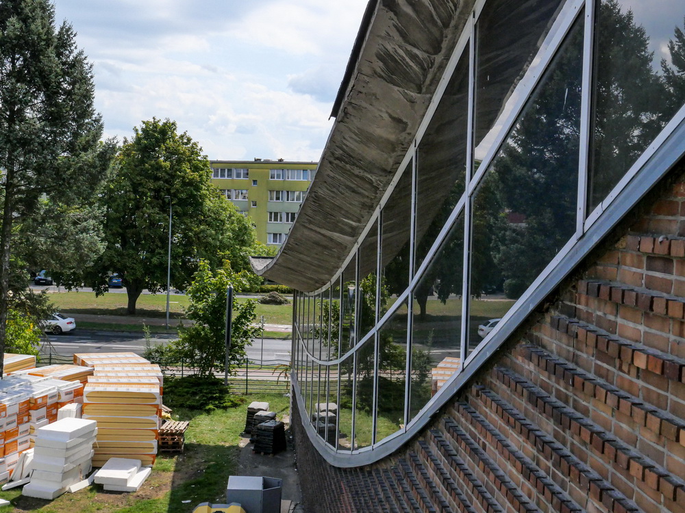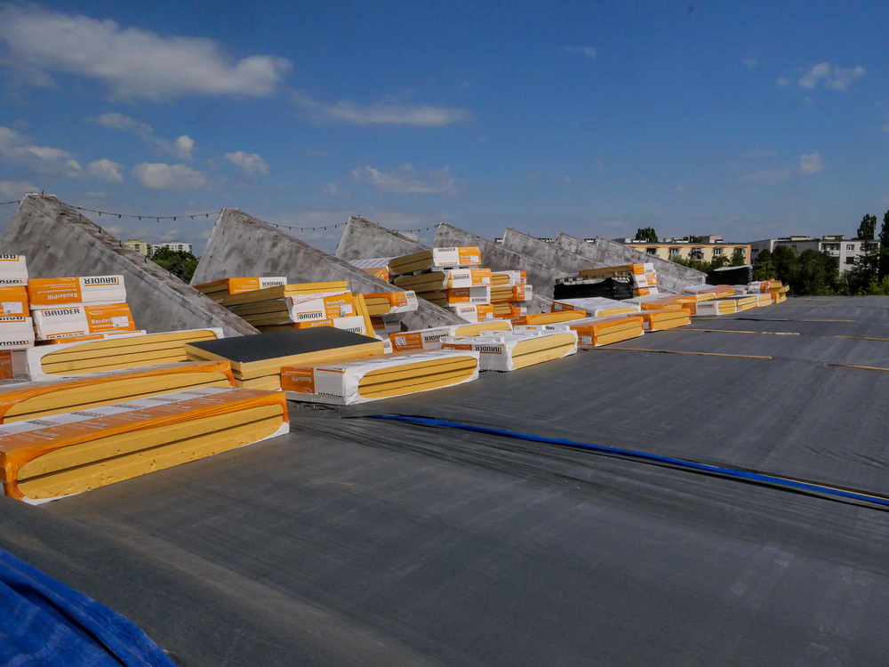 Główny front robót znajduje się najwyżej, na dachu, który od lat sprawiał najwięcej problemów. Na części nad basenem stare pokrycie, składające się z… kilkunastu warstw papy i innych szczeliw, zostało zdjęte. Będzie tam nowa nawierzchnia. Ta jest już widoczna na części dachu od strony wejścia głównego.